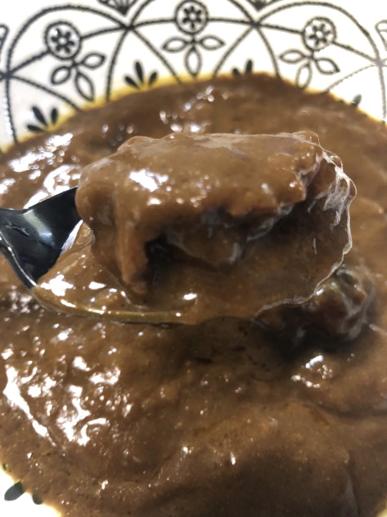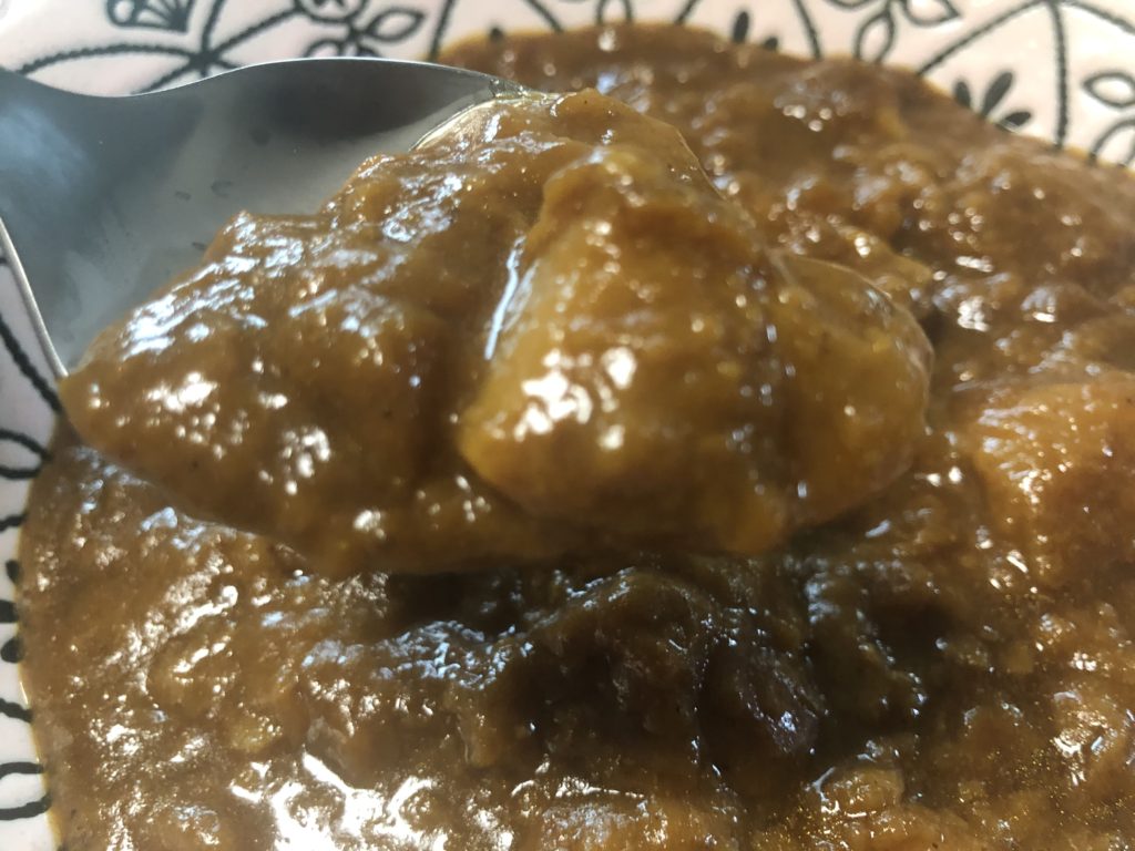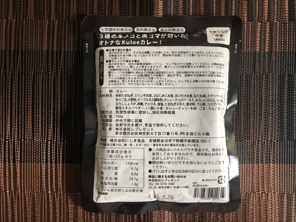 カレーソースの見た目は黒め。これはゴマの色だと思われる。辛さは中辛表記で、スパイシー感もなくまさに中辛。ゴマの甘味が一段と辛味を抑えている。3種類のキノコ(エリンギ、ぶなしめじ、まいたけ)がふんだんに使われており、最後の一口までキノコの食感を愉しむことができる。内容量が150gと少なめなので、一般的なペースで食べるとゴハンが余ってしまうかも。