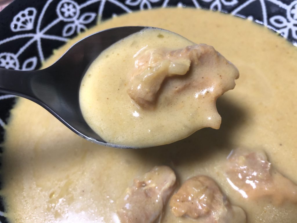 甘味の強さが特徴。表記状も甘口である。酸味は微かで、レモン感はほとんど感じなかった。カレーソースはコーンポタージュのような味わいだ。玉ねぎのツブツブとした食感を愉しめる。肉は写真通り4つ入っている。若干鶏胸肉ならではのパサつきを感じる。