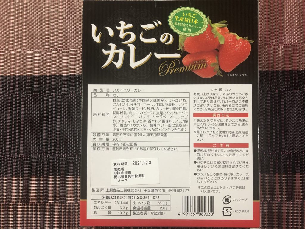 キワモノっぽいネーミングであるが、いわゆるネタ系のカレーではなく、しっかり美味しく食べることができる。写真で確認して欲しいが、内容量が200gと量が多い。カレーソースは粘度がある。口当たりは甘く、後味はに確かないちご感がある。辛さの表記はないが、甘口から中辛の間の印象。一般的な甘口カレーの甘さとは異なり、上品な苺の甘味が口内に広がる。例えるならばいちごジャムのような甘さであるが、これが意外にもカレーと相性が良い。カレーソースには人参、じゃがいも、肉のブロックがゴロゴロ入っているので、具沢山で満足感がある。