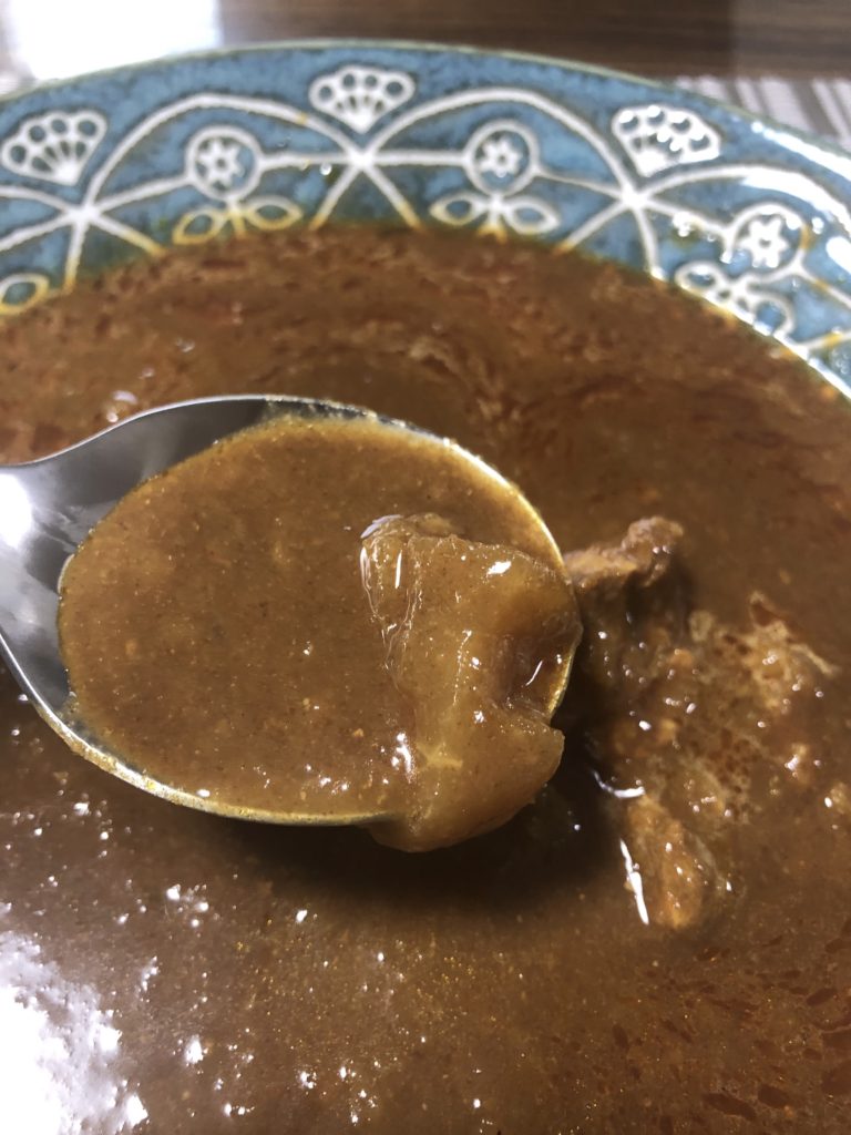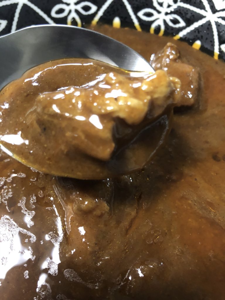 味付けは甘めでありながらも、後味として辛みを感じる。辛さの表記はないが、中辛といったところだ。カレーソースは野菜と果物がたっぷり溶け込んでおり濃厚。具材のバラエティ感はないが、複数個入った牛肉の存在のインパクトあり。大きい塊でありながら、舌で切れるほどによく煮込まれており、とろけるような食感である。