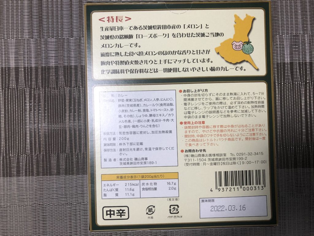 キワモノっぽいネーミングであるが、いわゆるネタ系のカレーではなく、しっかり美味しく食べることができる。写真で確認して欲しいが、内容量が200gと量が多い。カレーソースはサラサラ。口当たりはスパイシーで、後味としてメロンの香りが鼻に抜ける。辛さは中辛の表記通りの印象。ローズポークのブロックは2つ入っており、ポークにもメロンの香りが染みている。具沢山ではないが、玉ねぎなどの野菜のツブツブ感の愉しめるカレーソースである。メロンであろう塊も3つ入っていたが、こちらには逆にしっかりとカレーの味が染みていて、多分メロンだなという程度の心証である。