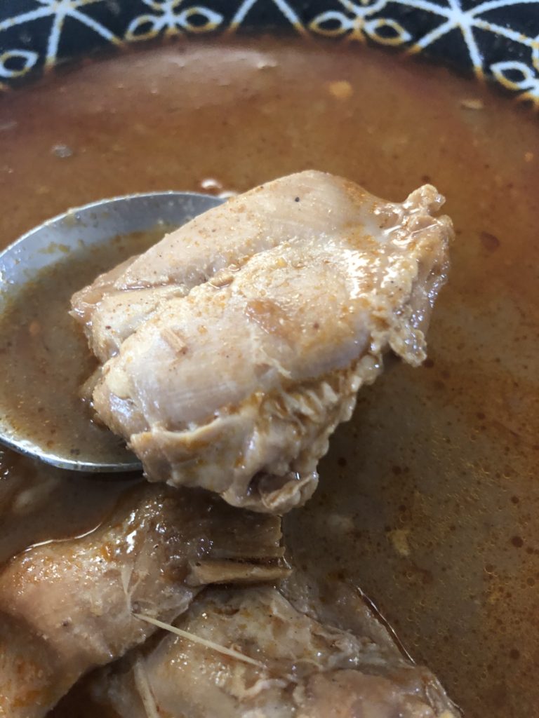 カレーソースはスープカレーのような粘度をほぼ感じない「しゃばしゃば」なタイプ。細かく刻まれた玉ねぎのツブツブ感を感じることができる。ぱっと見も辛そうに見えるが、表記上中辛で体感も中辛。スパイシーではあるが、味わいはまろやかである。パッケージ写真にあるピーナッツのようなものはカルダモンシードであり、1粒入っていた。写真通りごろっとしたチキンが2つ入っている。食べ応えはあるものの、固めでパサつきがある。