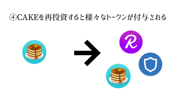 以前はLPトークンをステークするとCAKEトークンが付与され、CAKEトークンをステークするとSYRUPトークンが付与され、SYRUPトークンをステークすると様々なトークンが付与されるという仕組みであったが、SYRUPトークンのコントラクトにバグが見つかったためにSYRUPトークンの付与とステーキングの工程が削除され、現在の形式になっている。