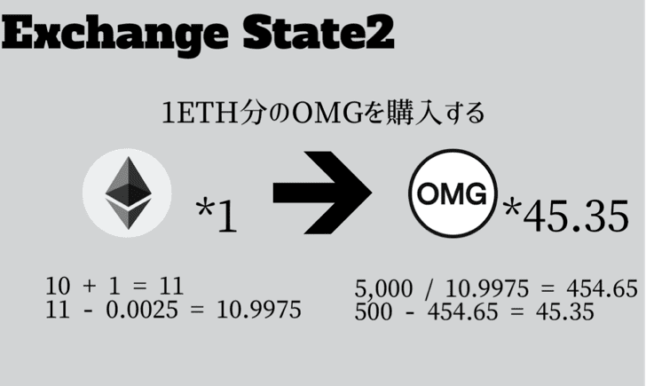 この場合、購入者は45.35 OMG / ETHのレートを受け取ったが、この取引により価格が変動している。もし別の購入者が同じ方向に取引を行うと、OMG / ETHのレートがわずかに低くなる。