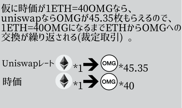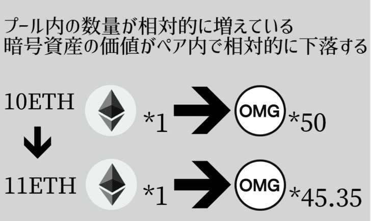 ETH_pool * OMG_pool = invariant(イーサプールとOMGプールの積が不変量)となるように自動的に設定される。