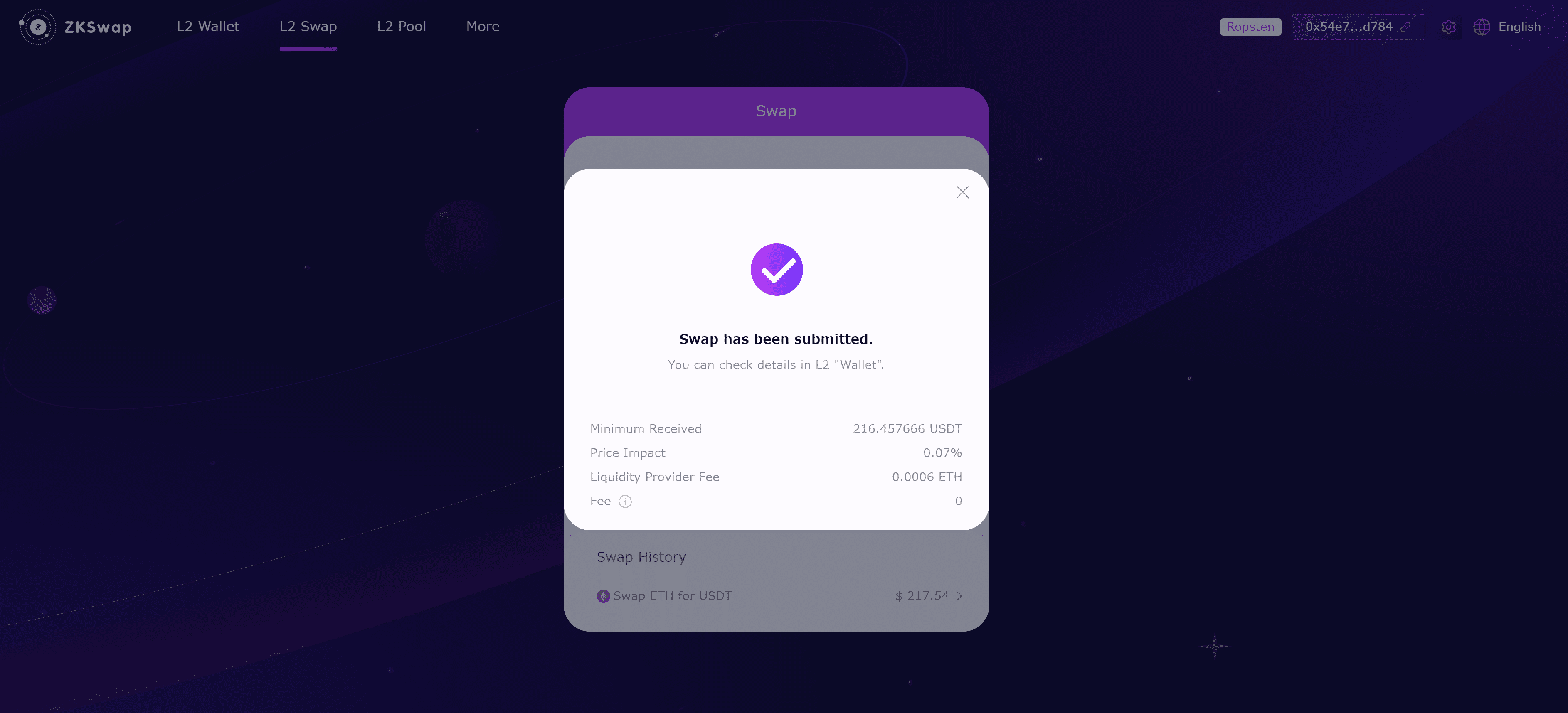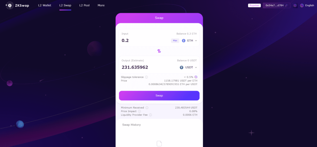ここではイーサとUSDTを交換してみる。なお、前述のとおりL2上での取引であるためガス代はかからない。