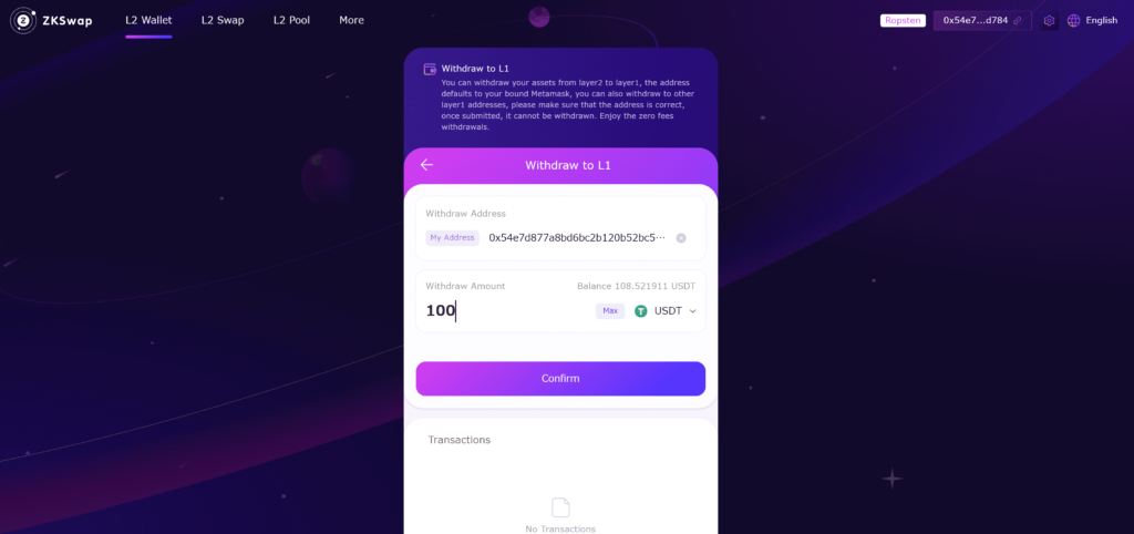 先ほど交換したUSDTを100単位引き出す。注書きを読む限り、ここではガス代を要しないようだ。
