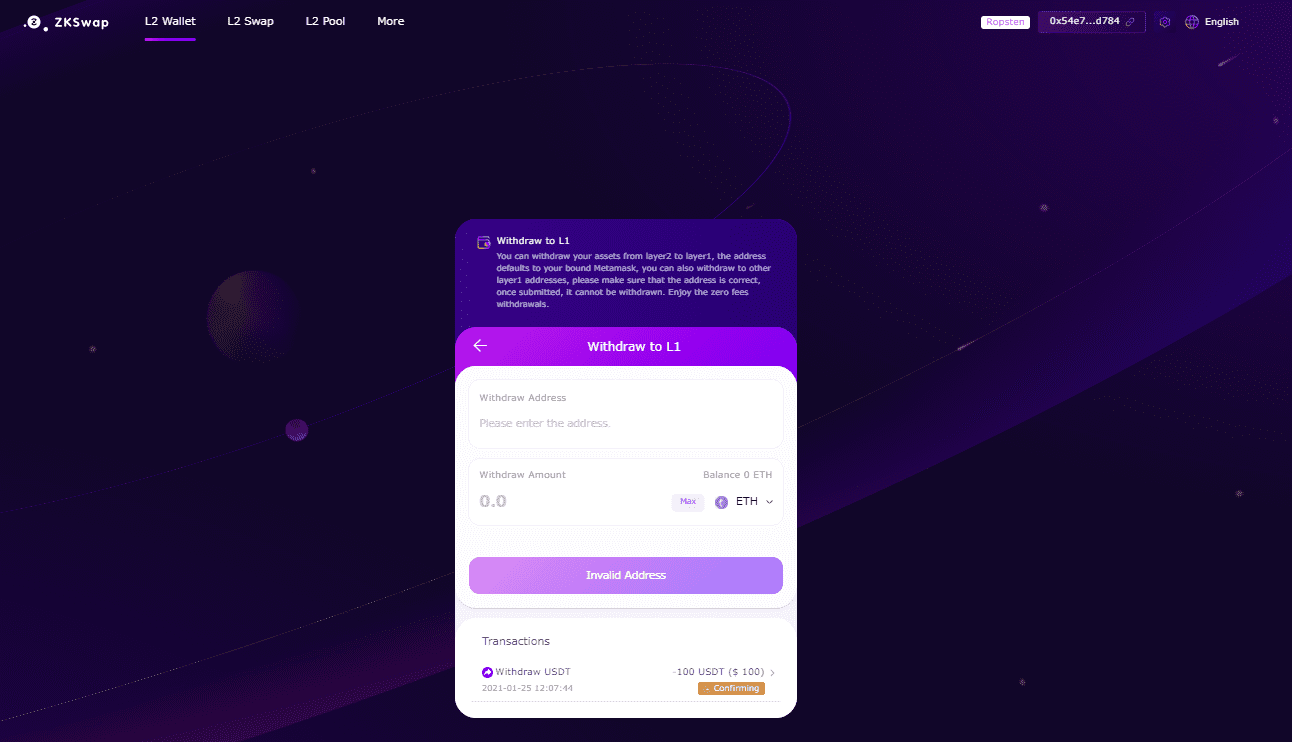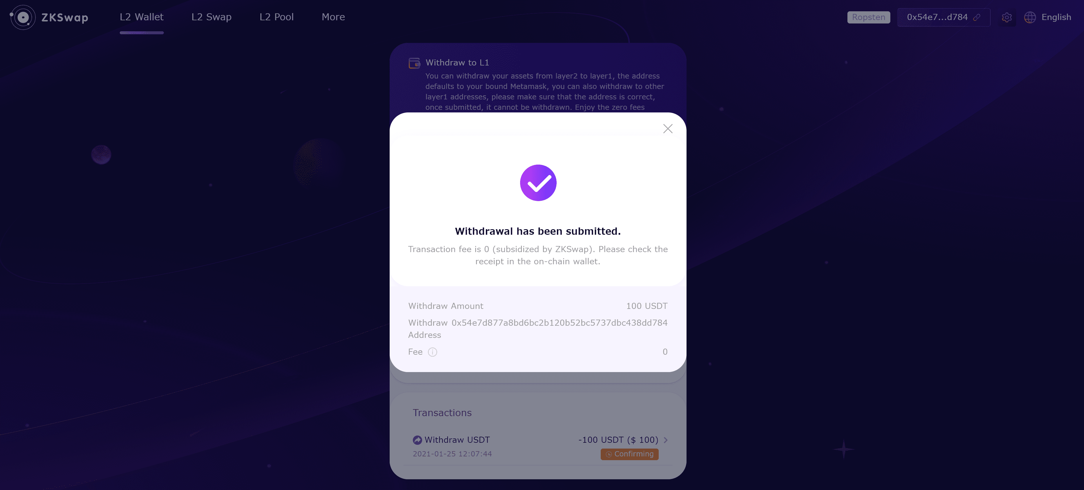 デポジットしていたトークンのロックが解除され、ZKSwapコントラクトから対応するL1のウォレットに送信される。