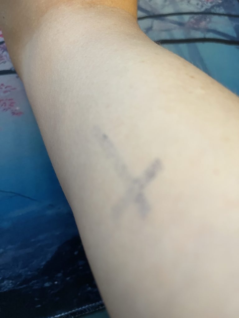 その後、24時間経過すると以下のように強く青黒い発色がある。二枚目の写真は1週間経過時、三枚目の写真は2週間経過時のものであり、実際に2週間でほとんど消えていることが確認できるだろう。
